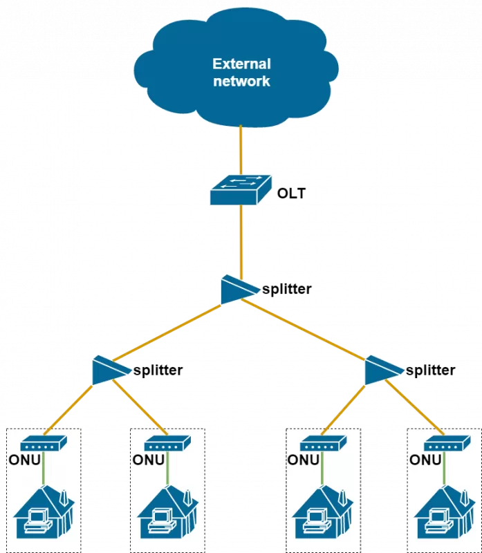 GPON – технология построения гигабитных пассивных оптических сетей, применяемая для подведения оптических кабелей непосредственно до абонента. Параметры пропускной способности: Нисходящий поток - 1490 нм, 2,4 Гбит/с., восходящий поток - 1310 нм, 1,2 Гбит/с. За счет невысокой стоимости оборудования, гибкости сети и сравнительно простого последующего технического обслуживания данная технология применяется в основном в местах с низкой плотностью абонентской базы (частный сектор, коттеджные поселки, производственные базы и т.д.). Скорость доступа для каждого абонента ~ 1Гбит/с