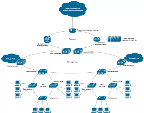 Любую сеть можно разделить на уровень доступа, уровень агрегации и ядро сети. В случае большой протяженности сети можно условно добавить транспортный уровень.