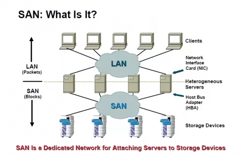 Основное применение SAN (Storage Area Network) - консолидация дискового пространства серверов на дисковых ресурсах. Дисковое хранилище экономно в использовании, просто в управлении и имеет высокую производительность. В случаях, когда нескольким серверам нужен доступ к одному пространству, например для виртуализации и кластеризации, данные системы особенно эффективны.