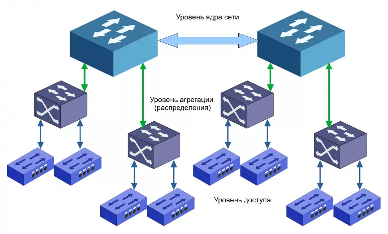 Помимо уровней модели OSI (такие как L2 и L3), в источниках часто упоминаются «уровень доступа», «уровень агрегации», «уровень ядра сети».