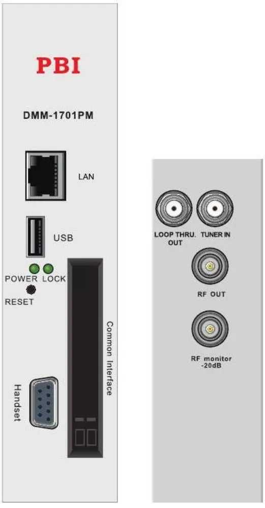 Серия DMM-1701PM - это разработанные в 2012 году модули сдвоенных аналоговых модуляторов для платформы DMM-1000. DMM-1701PM имеют на входе DVB-S/S2/C/T/T2 приемные демодуляторы и поддерживают декодирование стандартов SD/HD MPEG-2/MPEG-4 AVC H.264 для подачи на встроенный модулятор. RF выход - два аналоговых (соседних) канала в диапазоне 48 - 862 МГц. Уровень выходного сигнала - 100 дБмкВ. Поддержка BISS-1, BISS-E. Сдвоенный CI слот для многоканального декодирования закрытых каналов. Динамические обнаружение и обновление PMT таблиц. Управление модулями можно производить удаленно (ПО HDMS) или с лицевой панели при помощи DMM-1000CU.