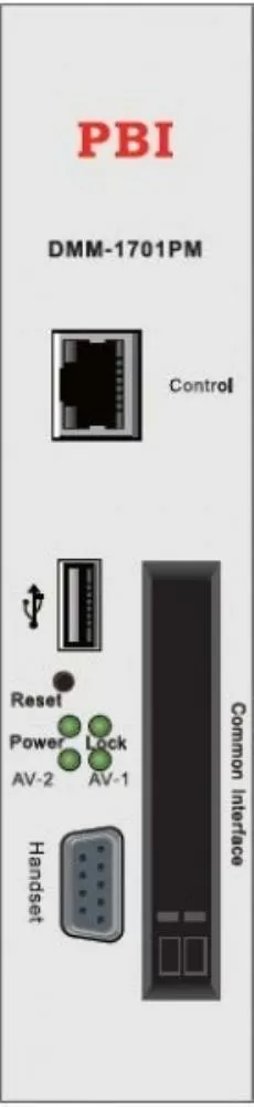 Серия DMM-1701PM - это разработанные в 2012 году модули сдвоенных аналоговых модуляторов для платформы DMM-1000. DMM-1701PM имеют на входе DVB-S/S2/C/T/T2 приемные демодуляторы и поддерживают декодирование стандартов SD/HD MPEG-2/MPEG-4 AVC H.264 для подачи на встроенный модулятор. RF выход - два аналоговых (соседних) канала в диапазоне 48 - 862 МГц. Уровень выходного сигнала - 100 дБмкВ. Поддержка BISS-1, BISS-E. Сдвоенный CI слот для многоканального декодирования закрытых каналов. Динамические обнаружение и обновление PMT таблиц. Управление модулями можно производить удаленно (ПО HDMS) или с лицевой панели при помощи DMM-1000CU.